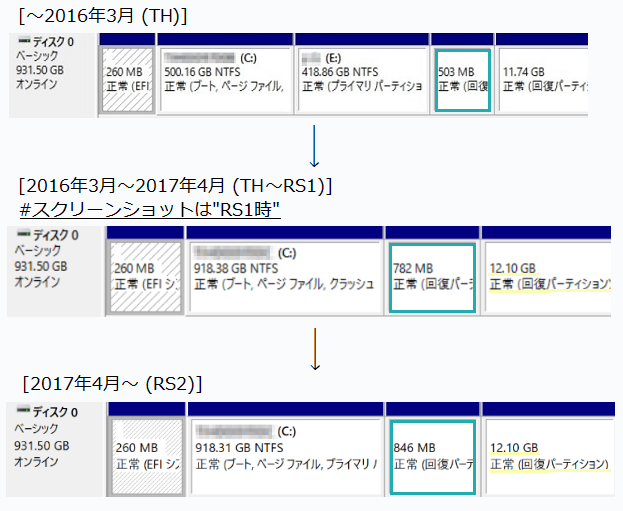 ・リカバリ→各種設定後、WindowsUpdateを行ないましたが、その後ハードディスク構成を確認したところ、リカバリ前より回復パーティション領域が広くなり、Cドライブ領域の一部が多く削られているのに気付きました。
